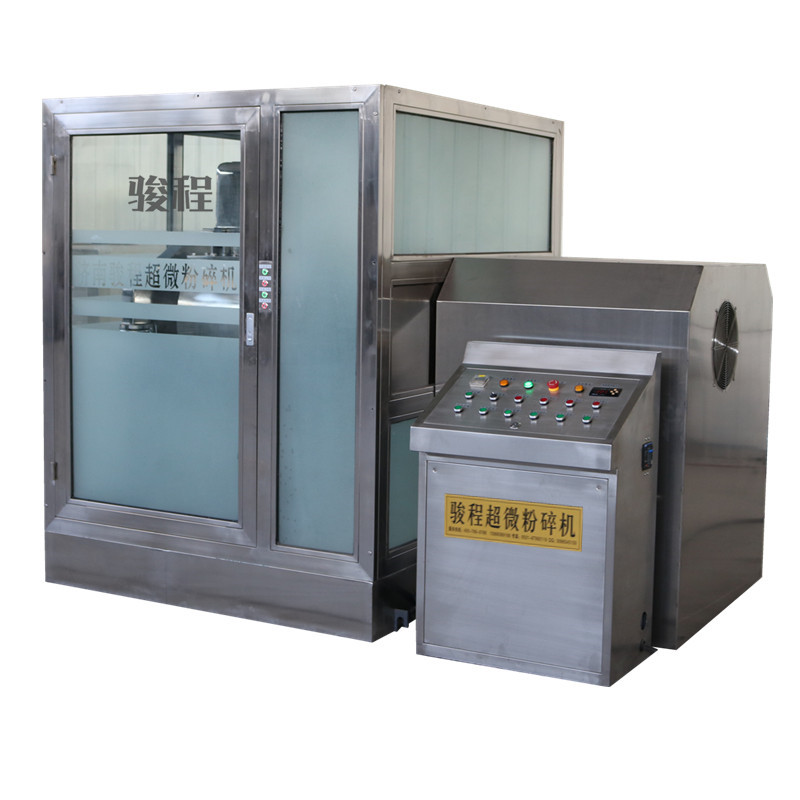 中藥在粉碎過程中,通過外界的擠壓,研磨,會產生大量的熱量,這樣就會發生物料高溫氧化、變質和有效成分的損失和偏析。對于纖維狀、高韌性、高強度、含油率高、含糖量高的物料采用普通粉碎方法很難達到超微粉碎。濟南駿程低溫粉碎機在粉碎時可根據要求,通過向磨筒套內通入冷卻水或配置制冷機來控制粉碎溫度。采用冷凍超微粉碎方法,利用物料在不同溫度下具有不同性質的特性,將物料冷凍至脆化點或玻璃體溫度之下,使其成為脆性狀態,在粉碎原料達到低溫、粉碎機內部為低溫情況下粉碎,物料與粉碎機內部均呈低溫狀態。粉碎天然植物在低溫下其韌性出現均勻地降低,雖沒有明顯的脆性轉變點,但隨著溫度降低其脆性增加的規律是存在的,并可找出一個脆性大的低溫范圍。并且,物料在快速降溫情況下,各部位由于不均勻收縮而產生內應力,極易引起薄弱部位破裂和龜裂,導致物料內部組織結合力降低。物料在磨筒內不斷被沖撞、擠壓、剪切當受到一定的沖擊時,極易破碎成細粉,達到超微粉碎的目的。
